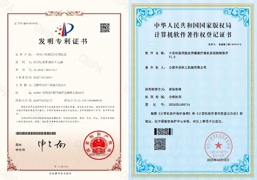 Zhongchen Light Machinery's independently developed control software for the sterile cold filling system, high-speed can filling and sealing machine system, blow-molding servo stretching filling and capping machine system, SXP750 intelligent self-cleaning bottle washing machine system, and PET large barrel servo long-tube filling system have successfully passed the National Copyright Administration's review and obtained computer software copyright registration certificates. The company has made significant progress in intellectual property protection, adding 30 new patents, including 14 invention patents. As of now, the company holds nearly 200 valid patents, has participated in the formulation of 10 national standards, 20 industry standards, and 2 group standards.