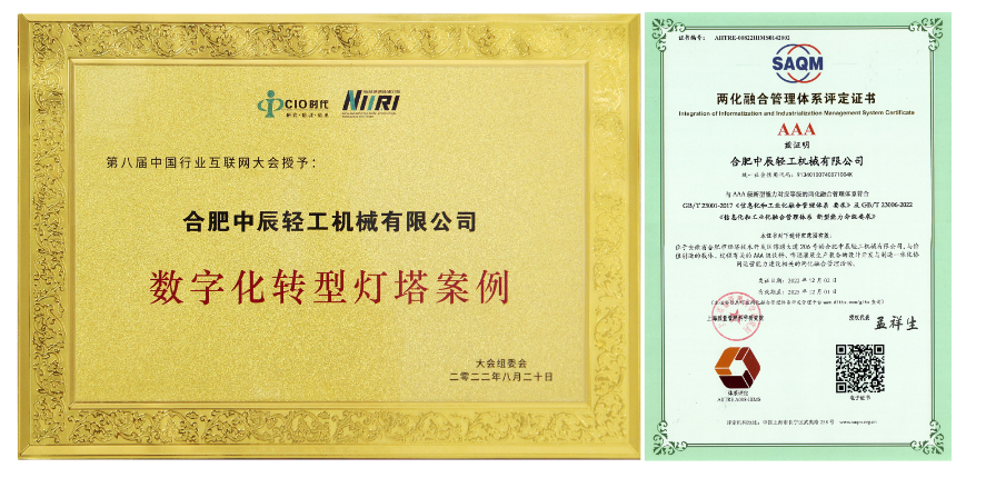 The digital transformation MES&WMS project of Zhongchen Light Machinery was officially launched, making it the first enterprise in Anhui Province to be selected as a "2022 Annual Digital Transformation Lighthouse Case Enterprise". The same year, it obtained the "Two Integration Management System Evaluation Certificate", completed the upgraded version of two-integration standard certification in a short time, and became a unit that obtained the highest AAA certification in two-integration management system. All of these indicate that Zhongchen Light Machinery has achieved a stage of results in its efforts to promote digital transformation construction.