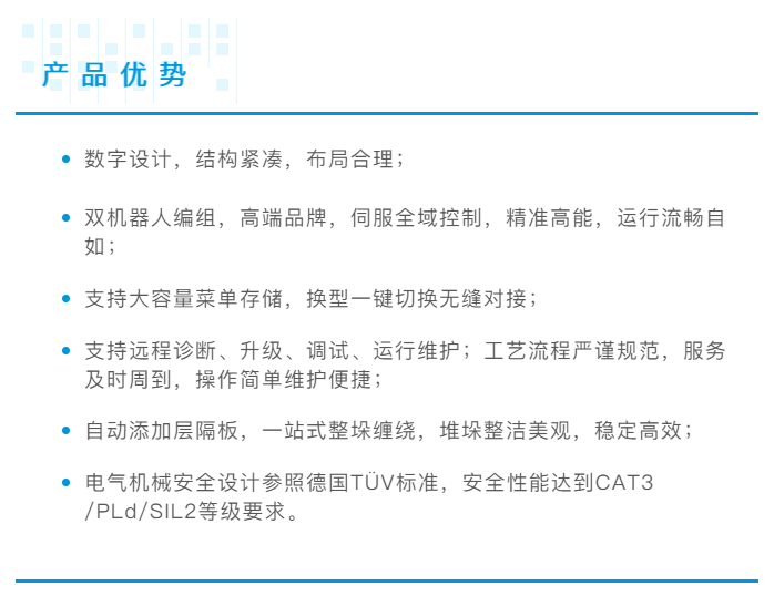 The ZC-MD120D Fully Automatic Robot Flexible Palletizing System is a high-end product meticulously developed by Baoji Nuobotai Ke Intelligent Packaging Equipment Co., Ltd. adhering to the concept of innovative development and in combination with the industry development trend. The design of the palletizing machine adopts the modular combination concept. The entire machine is mainly divided into two modules: the precise control module of dual robots; and the servo-controlled pallet layer conveying module. The mainframe module is divided into: the fully servo-controlled gantry series and the fully servo-controlled robot series, which can meet various customer demands. The entire process, including box (package) conveying, box (package) turning platform, assembly platform, full-layer platform, and palletizing mainframe, is precisely controlled by full servo, achieving the purpose of one-click model change. Meanwhile, the equipment operates smoothly and orderly, with accurate and smooth movement. The palletizing pattern abandons the traditional box turning method and adopts the flexible and precise arrangement by high-end dual robots. The palletizing mainframe is controlled by dual servo motors and is also equipped with a German imported RBPS cylinder brake control or full-layer robot curtain control, which is fast, stable, safe and reliable. The inlet and outlet of the equipment are equipped with a static screen system to distinguish between people and objects. The safety door adopts the KIP system, and the overall safety performance meets the requirements of CAT3/PLd/SIL2 level. It has a one-stop function of adding layer partitions, and is equipped with a high-quality winding machine to meet the multi-faceted demands of customers. This model of equipment features precise control, seamless switching, and is safe and stable. The stable production capacity is over 100 packages per minute and can be widely applied in the palletizing of different specifications of cans, glass bottles, and PET bottles after dry packaging and boxing in industries such as beer, beverages, drinking water, and seasonings.