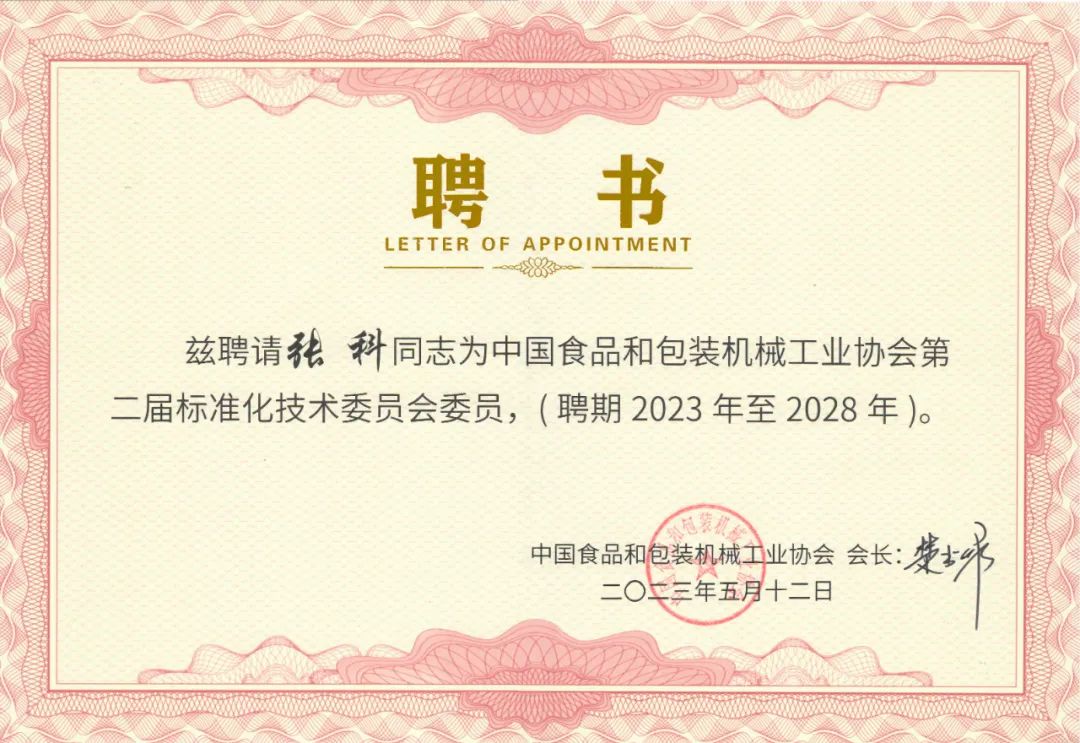 On May 12, the Second Standardization Technical Committee of China Food and Packaging Machinery Industry Association (T/CFPMA) was held. With more than 20 years of deep expertise in the field, Zhang Ke, a role model and outstanding contributor in the industry, was elected as a new member of the standardization technical committee.