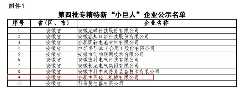 Standing at the forefront of the trend of breaking waves, we are now setting sail at the right time. On August 8, the Ministry of Industry and Information Technology of the State Council released the list of the fourth batch of specialized, specialized, featured and innovative small and medium-sized enterprises in Anhui Province, and Zhongchen Light Machinery successfully won the title of national specialized, specialized, featured and innovative small and medium-sized enterprises.